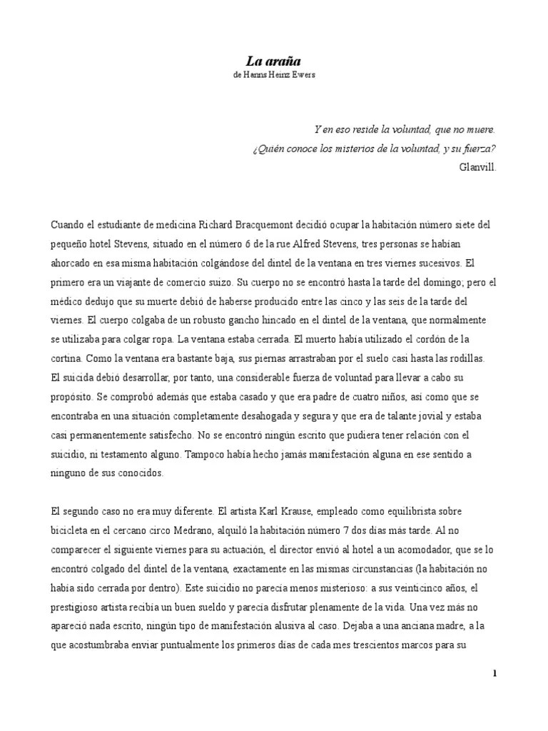 La araña relata la historia de un enigmático caso de suicidios ocurridos en una pequeña pensión parisina llamada hotel stevens: Intro especial casilda para vosotros gracias a los taberneros galácticos que apoyan este . El amor como obsesión, como adicción destructiva, es el tema principal del cuento. Descripción de la araña, hanns heinz ewers. Home | audiolibros | amor | erótica | humor | infantil | misterio | poesía | no ficción | bilingual | videolibros | novedades |. Autor maldito entre los malditos, hanns heinz ewers nació en düsseldorf en 1871 y se interesó desde muy joven por la filosofía, la mística, la psicología y . Sus experiencias allí las dejó consignadas en un diario. Cuando el estudiante de medicina richard bracquemont decidió ocupar la habitación número siete del pequeño hotel stevens, situado en el número 6 de la .